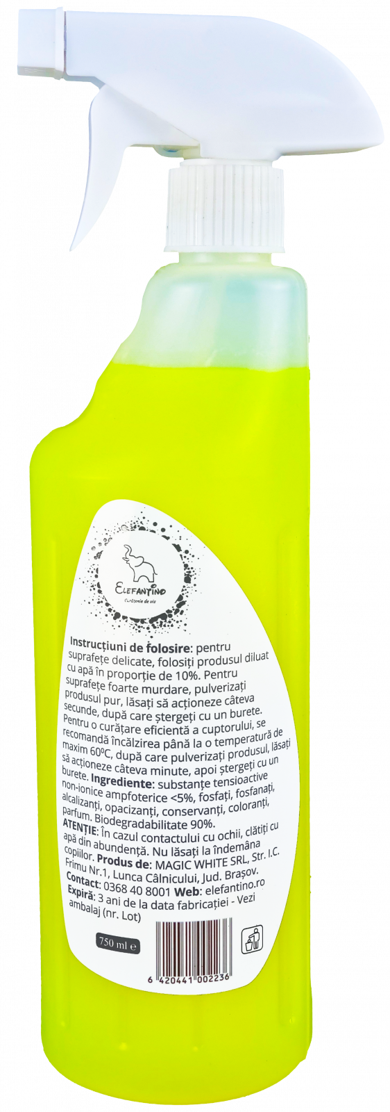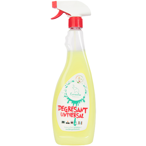Degresantul universal ecologic Elefantino este mult mai puțin agresiv cu pielea, datorită ingredientelor biodegradabile. Se îndepărtează ușor de pe suprafețele curățate și se clătește bine.